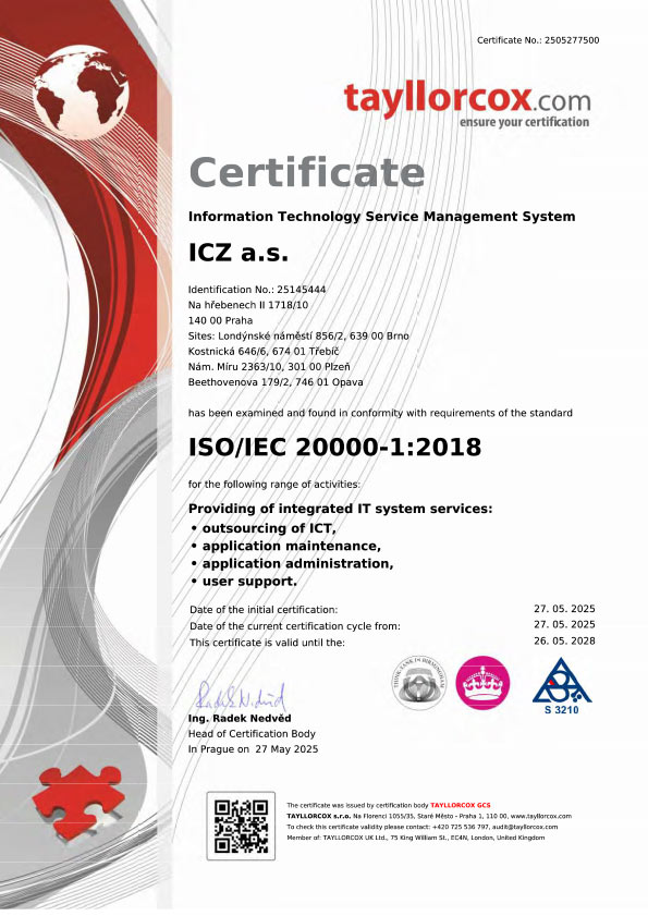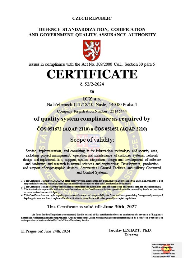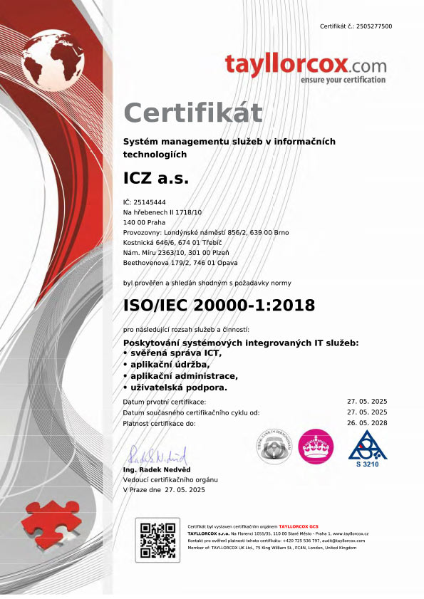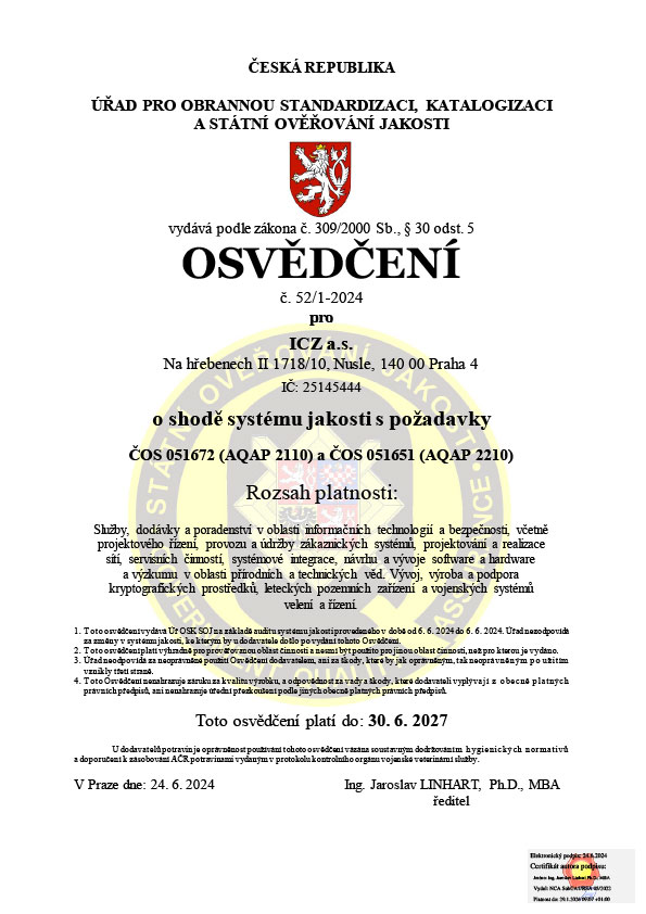 Ve Skupině ICZ je kladen velký důraz na zvyšování kvality a bezpečnosti nabízených služeb a řešení. Jedním ze způsobů, jak zabezpečit vysokou kvalitu poskytovaných služeb, je zavádění certifikovaných systémů řízení. Certifikace systémů poskytuje nejen jistotu efektivního a bezpečného fungování procesů v organizaci, ale je i konkurenční výhodou při získávání zakázek ve státní správě.