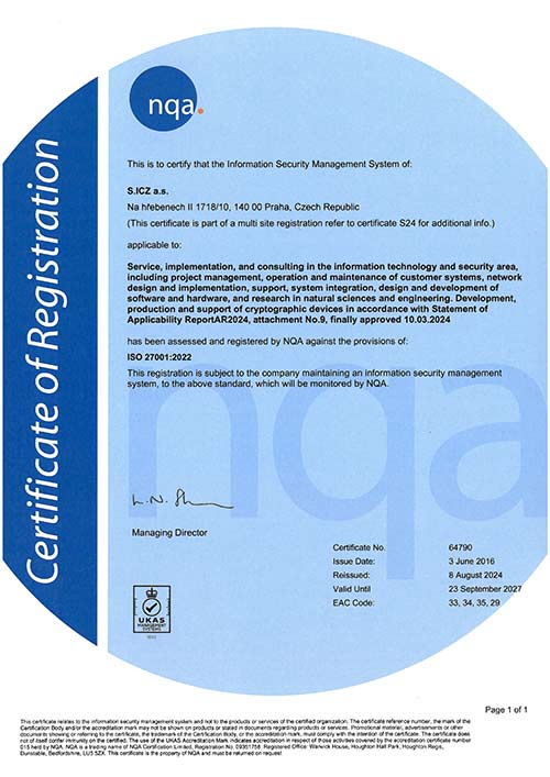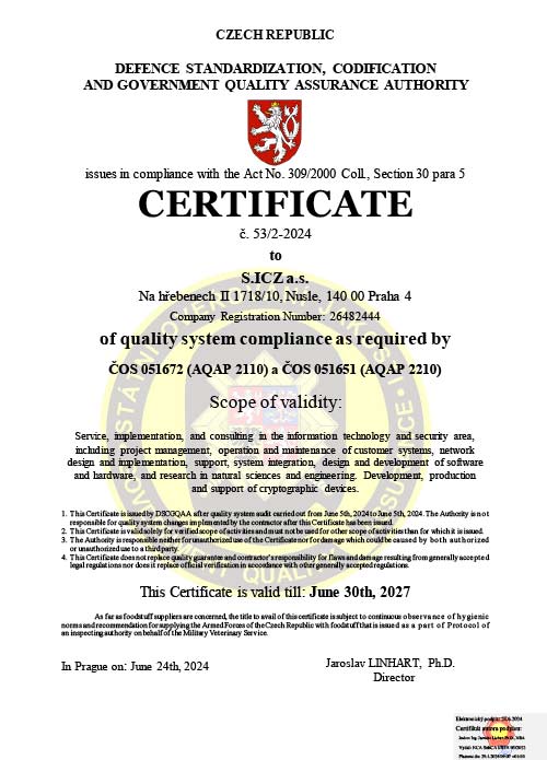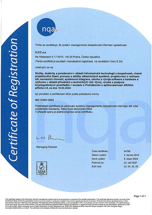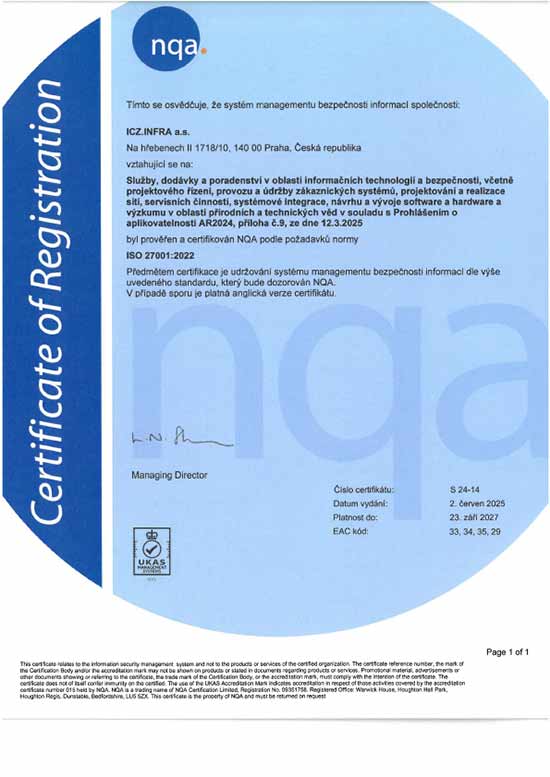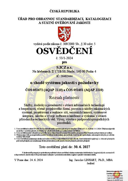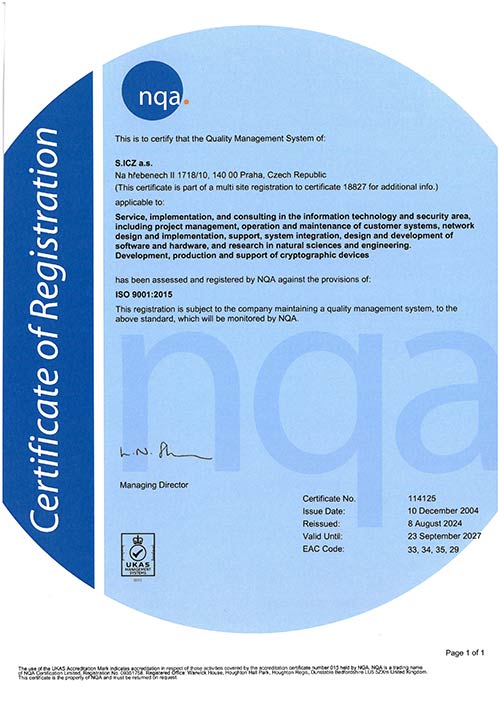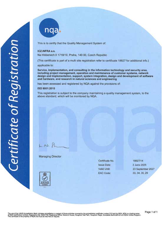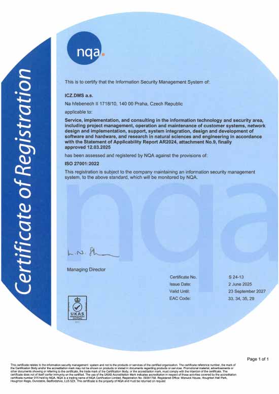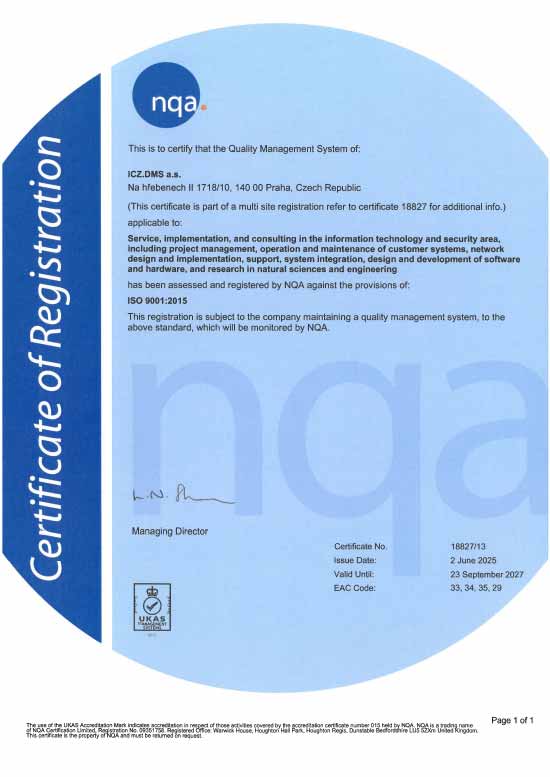 Ve Skupině ICZ je kladen velký důraz na zvyšování kvality a bezpečnosti nabízených služeb a řešení. Jedním ze způsobů, jak zabezpečit vysokou kvalitu poskytovaných služeb, je zavádění certifikovaných systémů řízení. Certifikace systémů poskytuje nejen jistotu efektivního a bezpečného fungování procesů v organizaci, ale je i konkurenční výhodou při získávání zakázek ve státní správě.