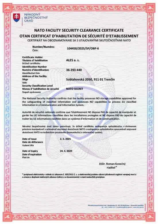 - Osvědčení Národního bezpečnostního úřadu ČR (NBÚ) na stupeň utajení DŮVĚRNÉ / TAJNÉ / PŘÍSNĚ TAJNÉ