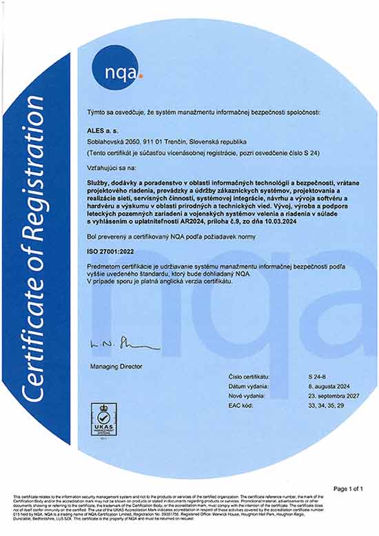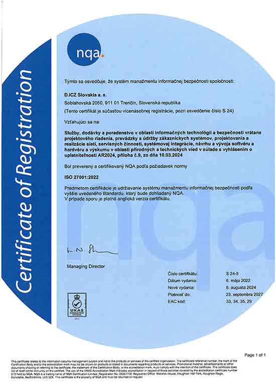 - Certifikát ISO 27001 – Systémy managementu bezpečnosti informací
