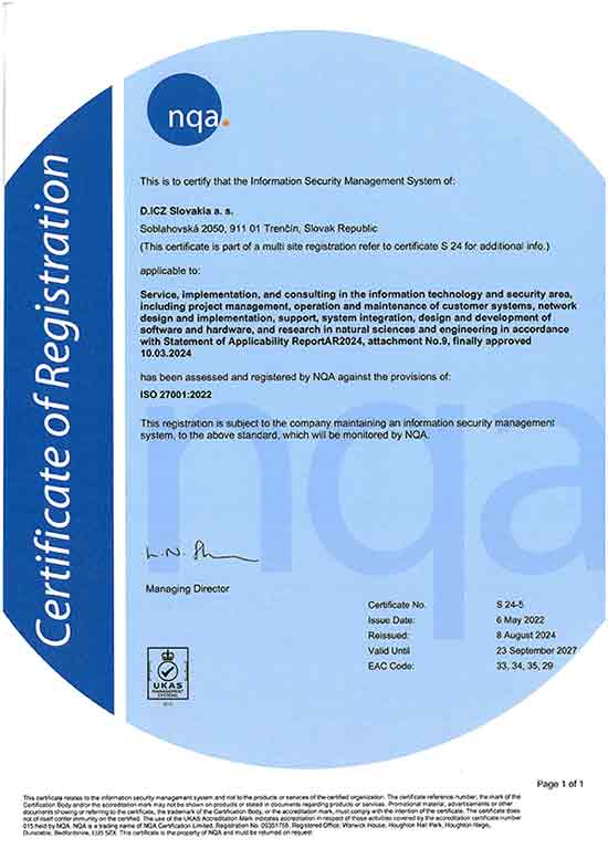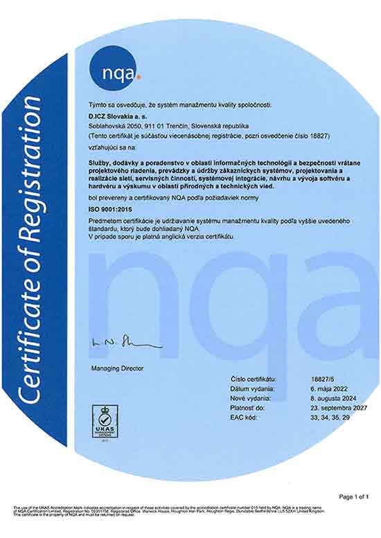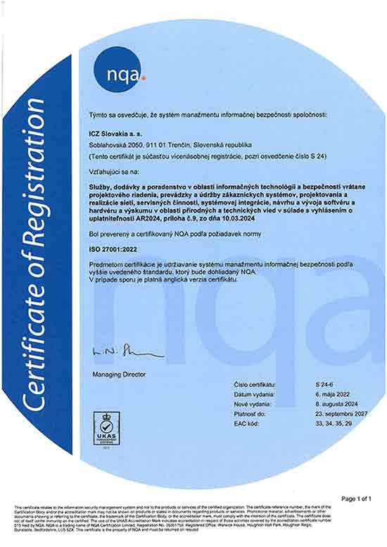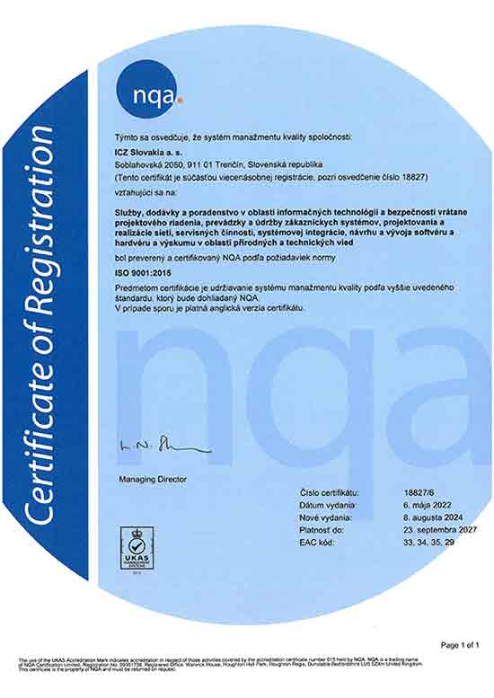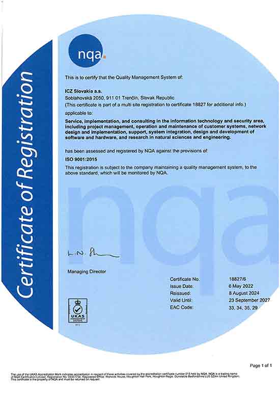 V skupine ICZ sa kladie veľký dôraz na zvyšovanie kvality a bezpečnosti ponúkaných služieb a riešení. Jedným zo spôsobov, ako zabezpečiť vysokú kvalitu poskytovaných služieb, je zavádzanie certifikovaných systémov riadenia. Certifikácia systémov poskytuje nielen istotu efektívneho a bezpečného fungovania procesov v organizácii, ale aj konkurenčnú výhodu pri získavaní zákaziek.